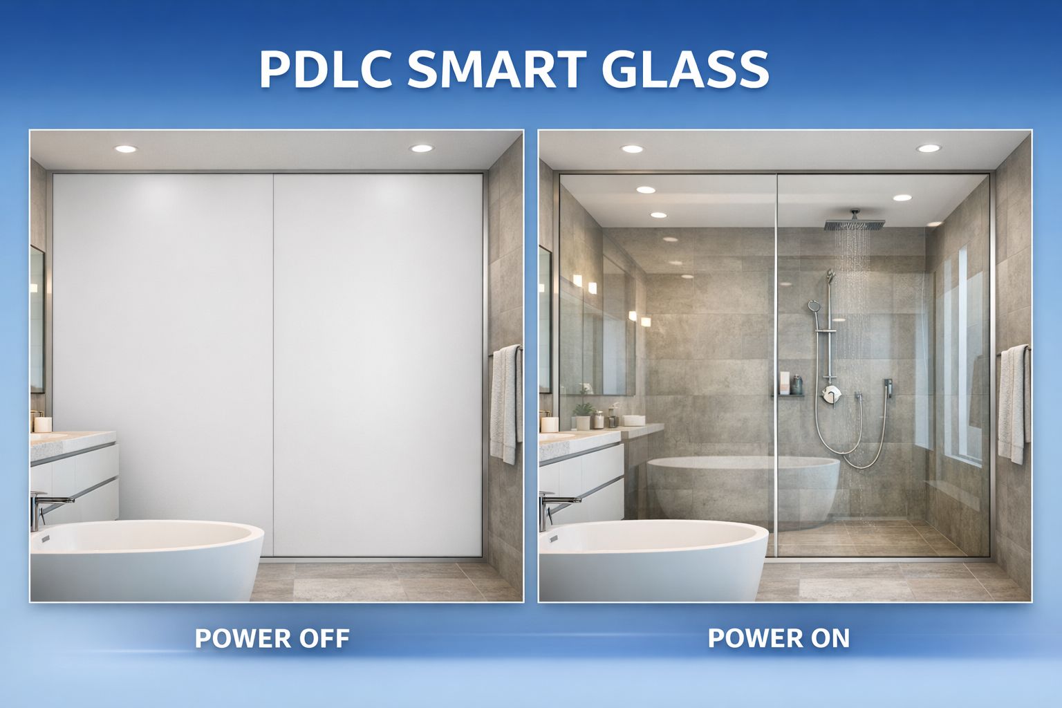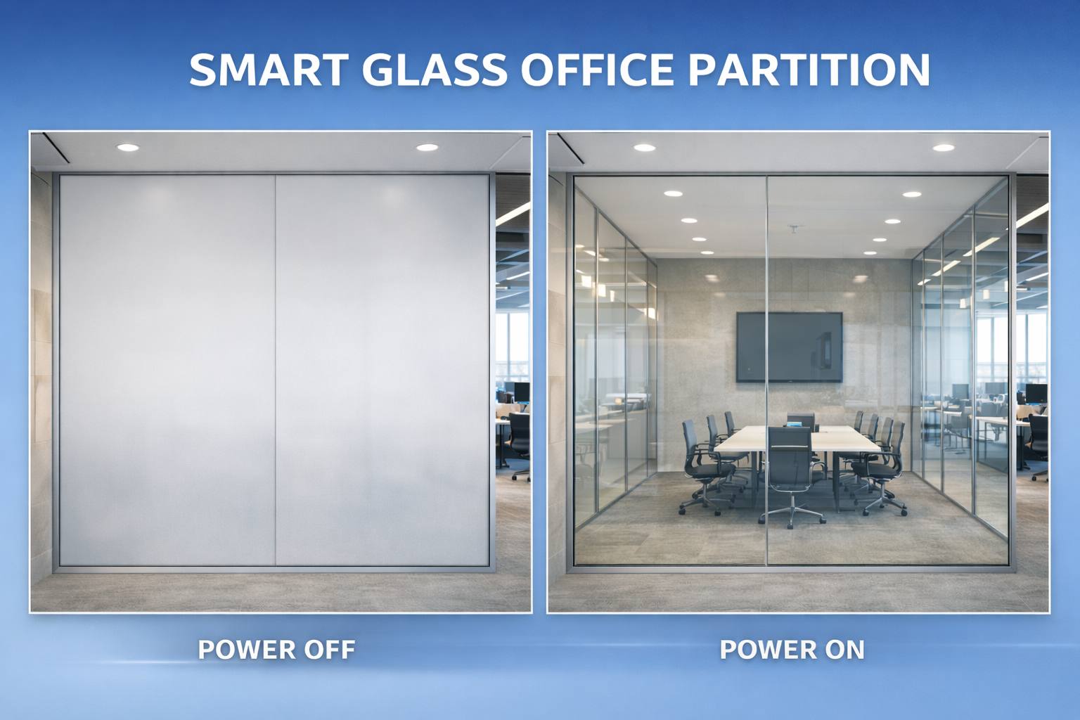 When the power is turned off, the glass instantly turns opaque (frosted), providing immediate privacy.